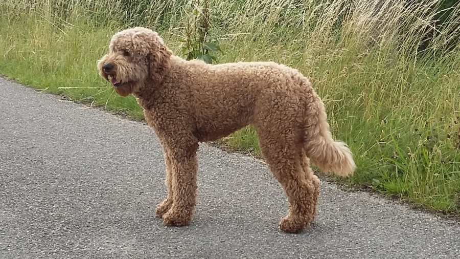 Jazz, onze standaard maat doodle, heeft een apricotkleurige curly fleece vacht en een zwarte neus.